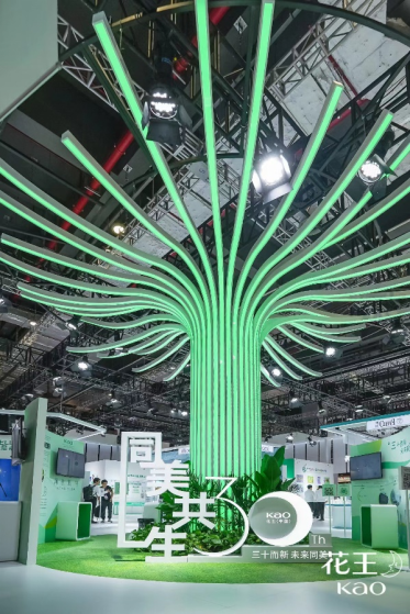 本屆進(jìn)博會(huì)上,花王向世界展示“同美共生”的美好愿景,并在現(xiàn)場展館的搭建上別具新意,打造了象征世界萬物和諧和持久生命力的“同美共生之樹”,全方位、多角度、立體化展示花王基于ESG視點(diǎn)不斷展開的實(shí)踐活動(dòng)。在展區(qū)設(shè)置上,圍繞“同美共生”愿景體系下三大重點(diǎn)領(lǐng)域——“和美自然”、“予美生活”、“創(chuàng)美未來”,分別呈現(xiàn)花王在多領(lǐng)域持續(xù)推進(jìn)的創(chuàng)新舉措,為觀眾帶來充滿科技感與前瞻性的創(chuàng)新盛宴。