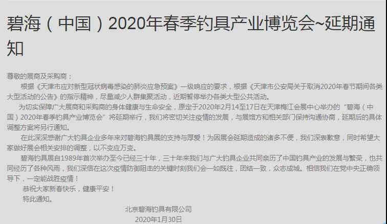 原定于2月14-17日于天津梅江展覽中心舉辦的碧海(中國(guó))2020年春季釣具產(chǎn)業(yè)博覽會(huì)宣布延期,具體開展時(shí)間待定。