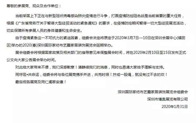 2020(春)深圳國(guó)際家紡布藝暨家居裝飾展覽會(huì)原計(jì)劃于3月7-10日在深圳會(huì)展中心舉辦,現(xiàn)已發(fā)布延遲通知,并將在2月10-15日發(fā)布公文公告具體舉辦時(shí)間。