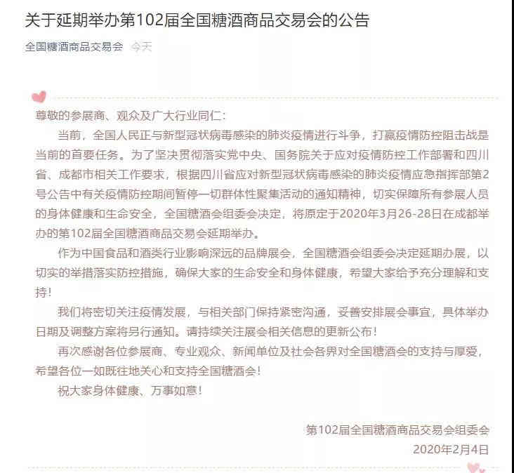 第102屆春季全國(guó)糖酒商品交易會(huì)原定于3月26-28日在成都舉辦,現(xiàn)已確定日期延后,具體時(shí)間另行通知。