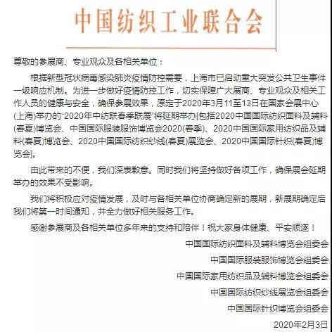 2020年中紡聯(lián)春季聯(lián)展將延期舉辦,原定于3月11-13日在國(guó)家會(huì)展中心(上海)舉辦的。
