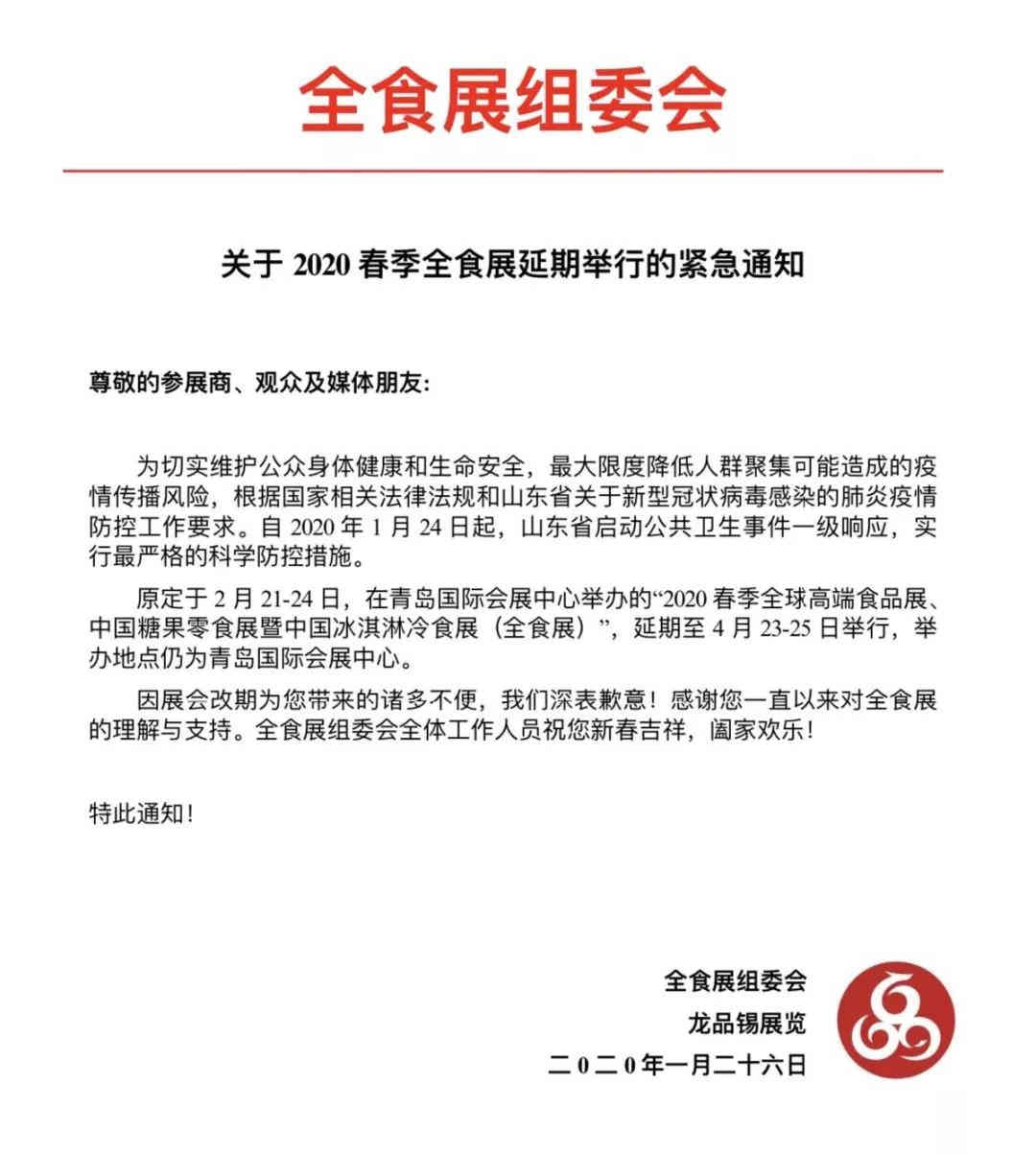 2020春季全球高端食品展、中國(guó)糖果零食展暨中國(guó)冰淇淋冷食展(簡(jiǎn)稱2020年春季全食展),將原定舉辦時(shí)間2月21-24日,延期至4月23-25日,舉辦地點(diǎn)仍為青島國(guó)際會(huì)展中心。