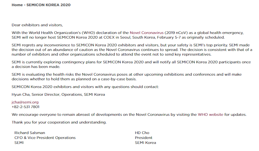 原定于3月18-20日在上海新國際博覽中心舉辦的“SEMICON China 2020國際半導(dǎo)體展” 與原定于2月5日至7日在韓國COEX首爾會(huì)議中心舉辦的韓國首爾國際半導(dǎo)體工業(yè)技術(shù)展覽會(huì)(SEMICON Korea 2020)宣布延期舉辦。具體時(shí)間安排將另行通知。