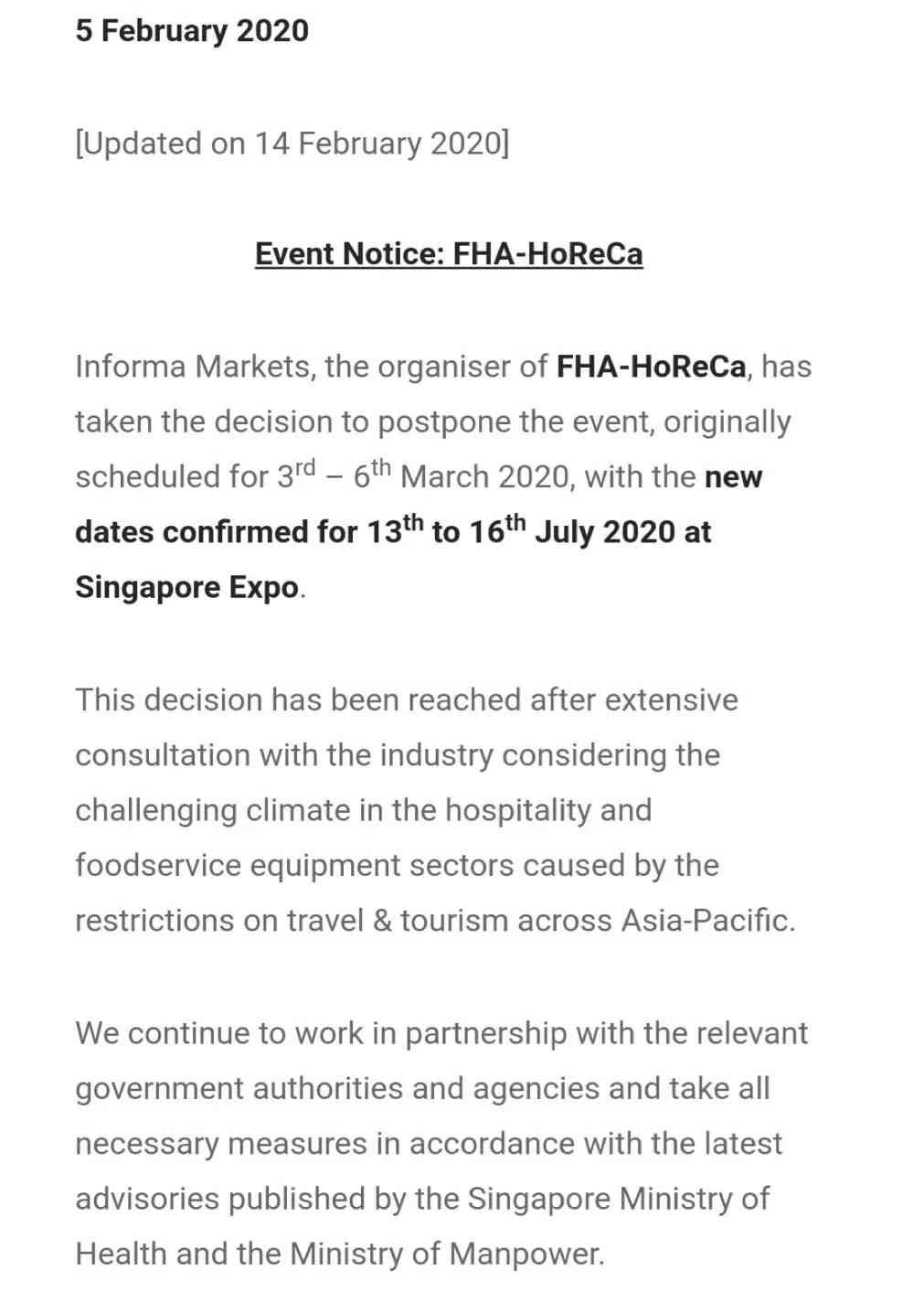 在新加坡展覽中心舉辦的每?jī)赡暌粚玫男录悠聛喼迖H食品與酒店展FHA將日期推遲。FHA-HoReCa原計(jì)劃于3月3-6日舉辦,日期修改為7月13-16日;原計(jì)劃于3月31至4月3日舉辦的FHA-Food&Beverage日期延后,具體安排另行通知。
